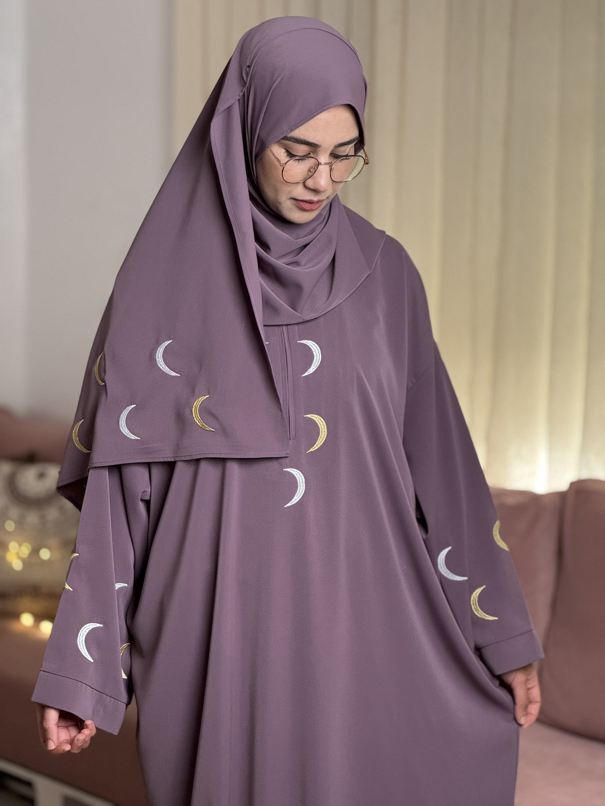 العباية مزيّنة عند الصدر واليدين بطرزة الهلال