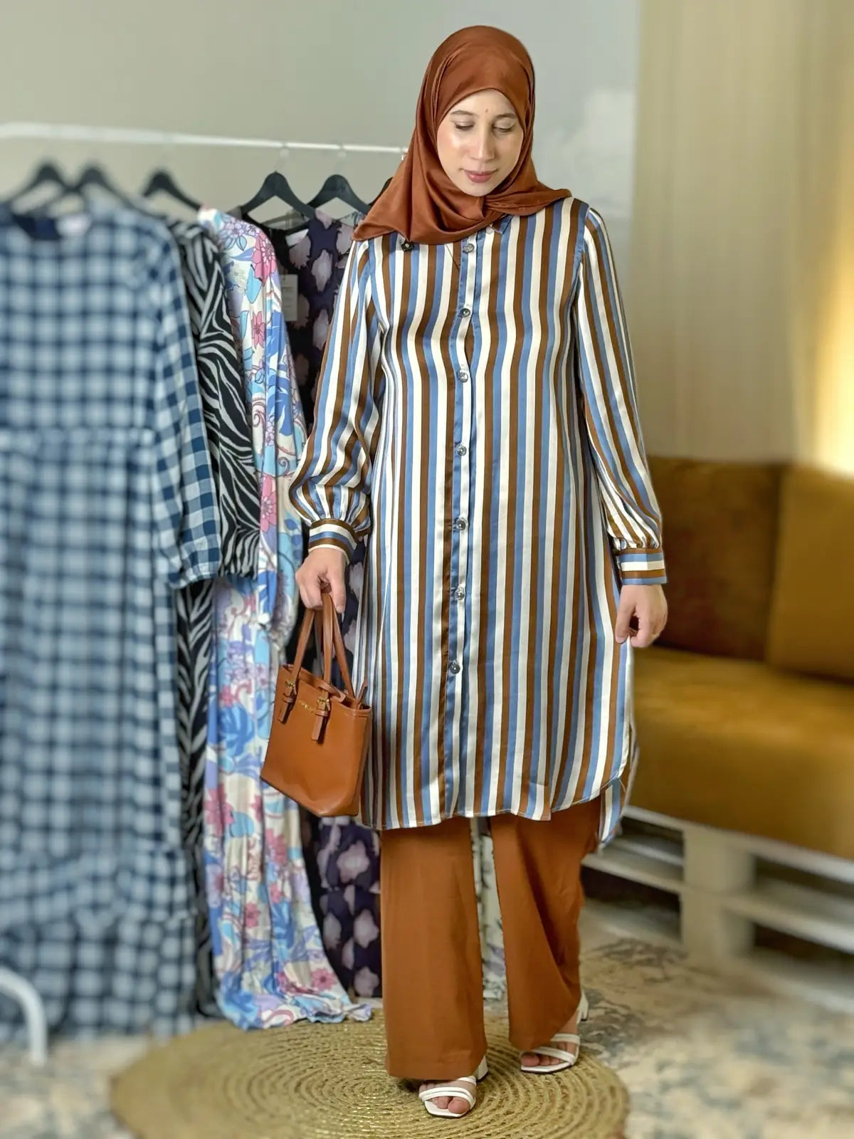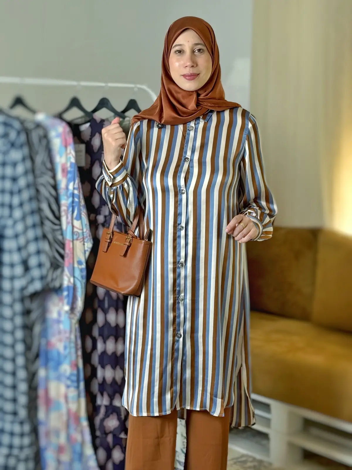 شوميز بخطوط طولية أنيقة مصنوع من ستان حريري ناعم يمنحك راحة وأناقة في نفس الوقت. تصميمه البسيط مع الأزرار الكاملة يجعله قطعة عملية وسهلة في اللبس، خصوصاً للنساء العاملات، الطالبات، وحتى الأمهات حيث أنه عملي للرضاعة كذلك