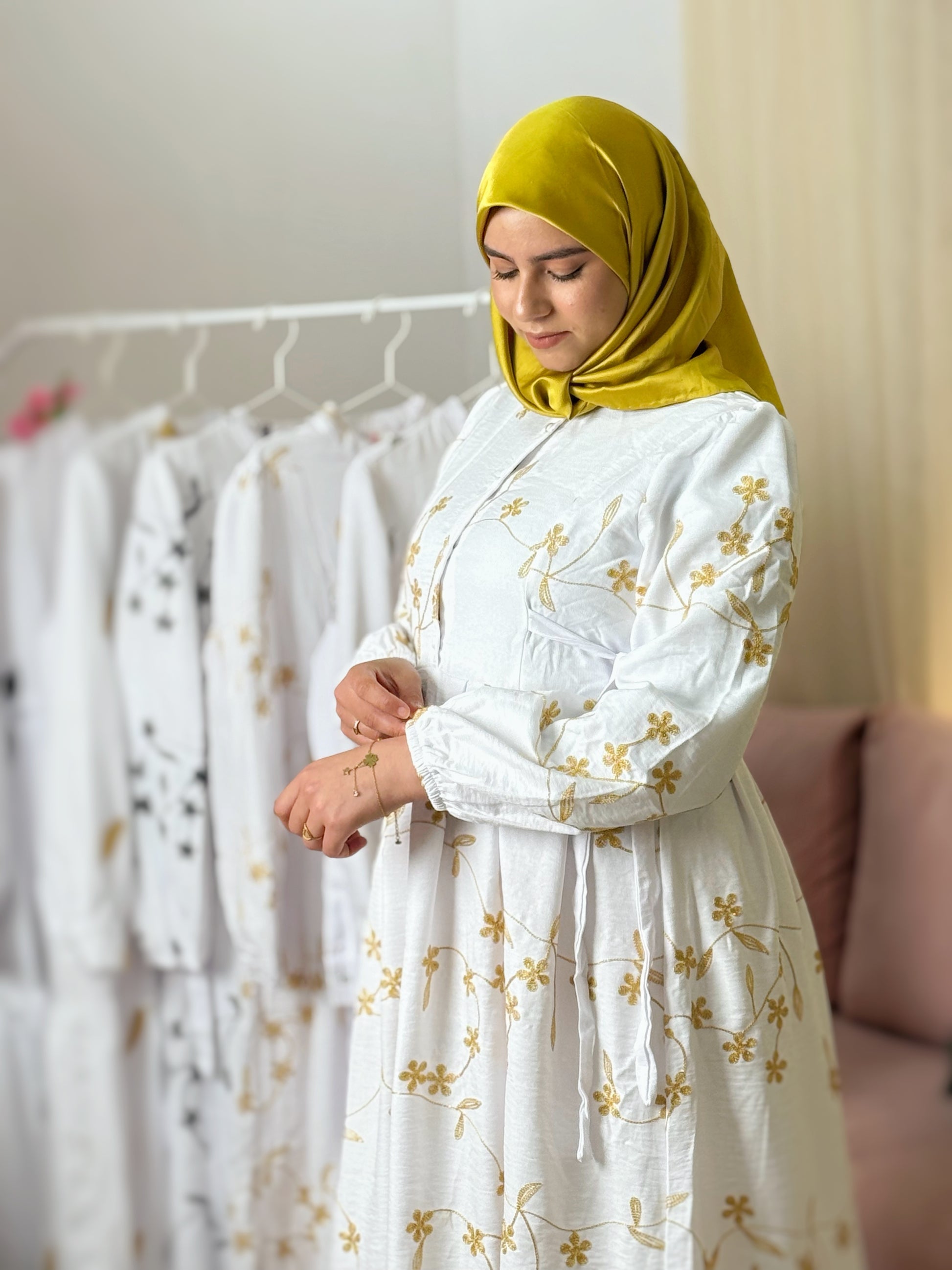 🎨 اللون: أبيض مع تطريز ذهبي بشكل عروش موردة