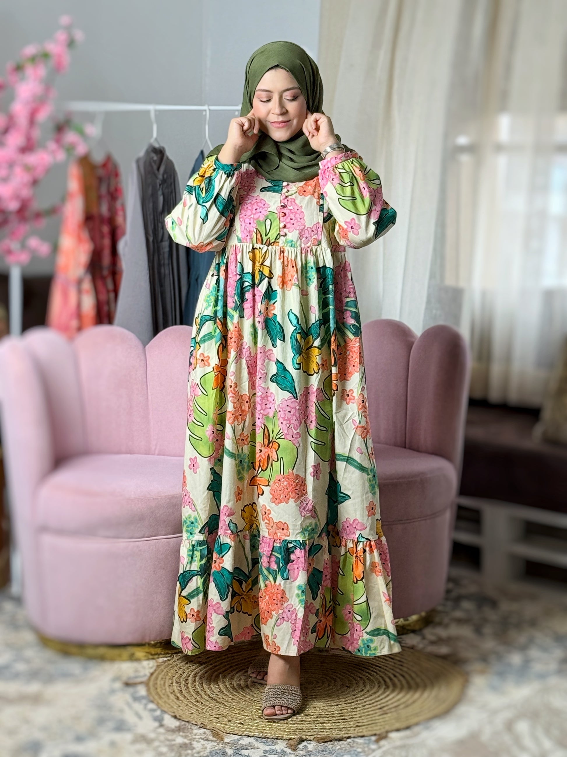فستان طويل مزوق بوريدات إستوائيين من ثوب بوبلين ممتاز وبتصميم جدا راقي