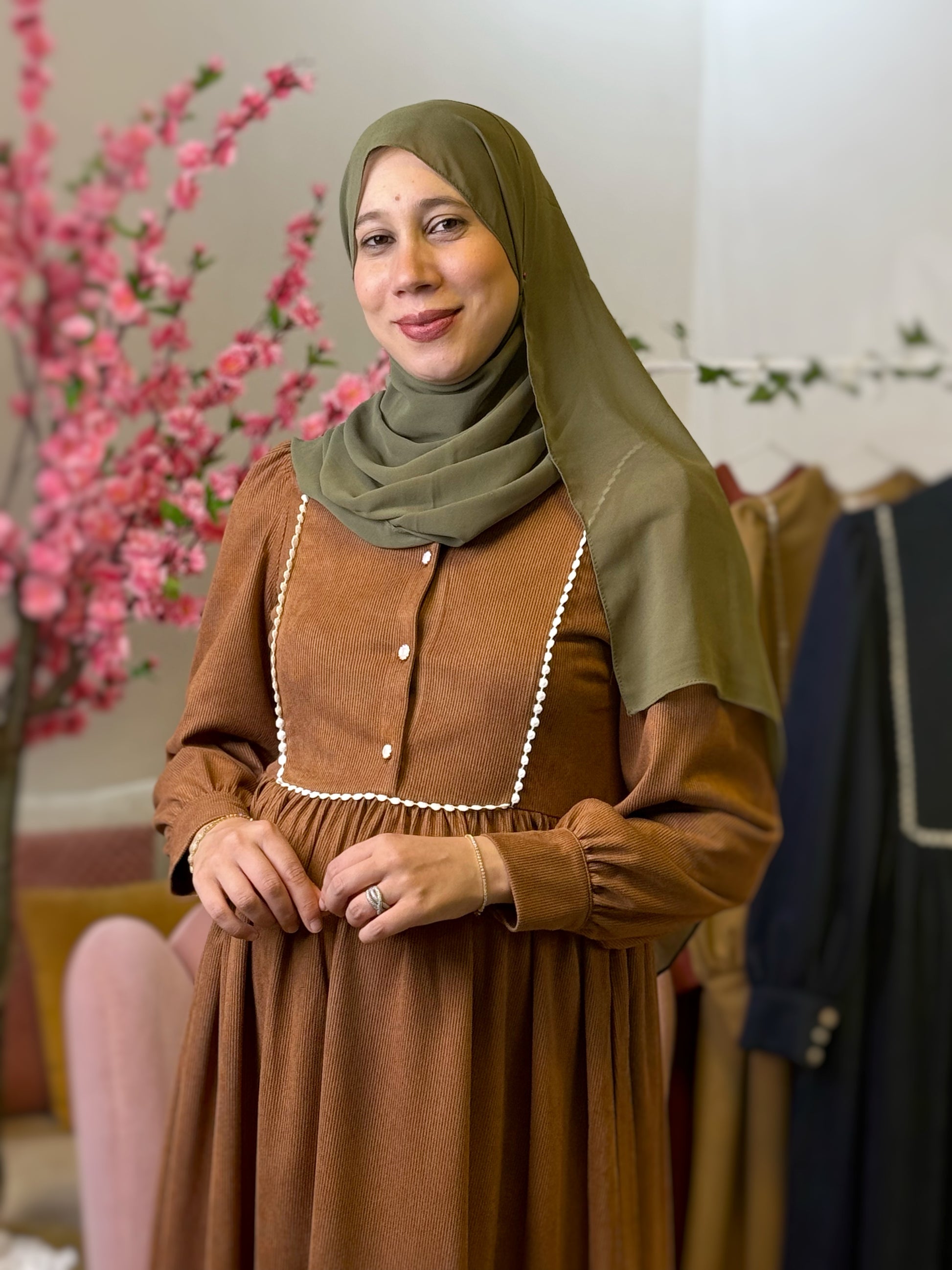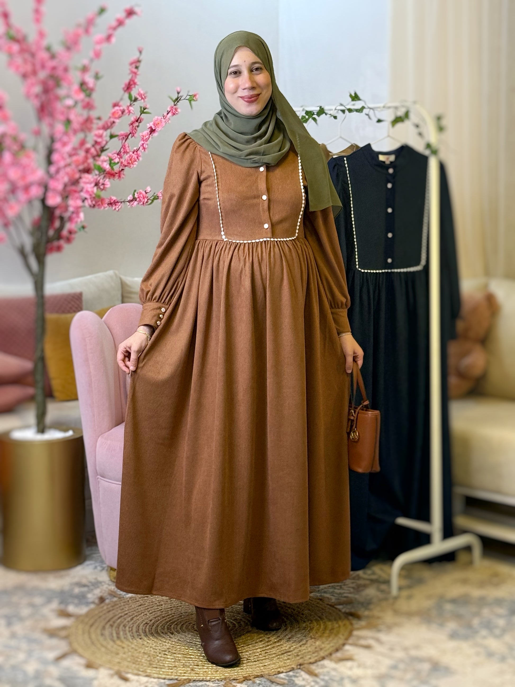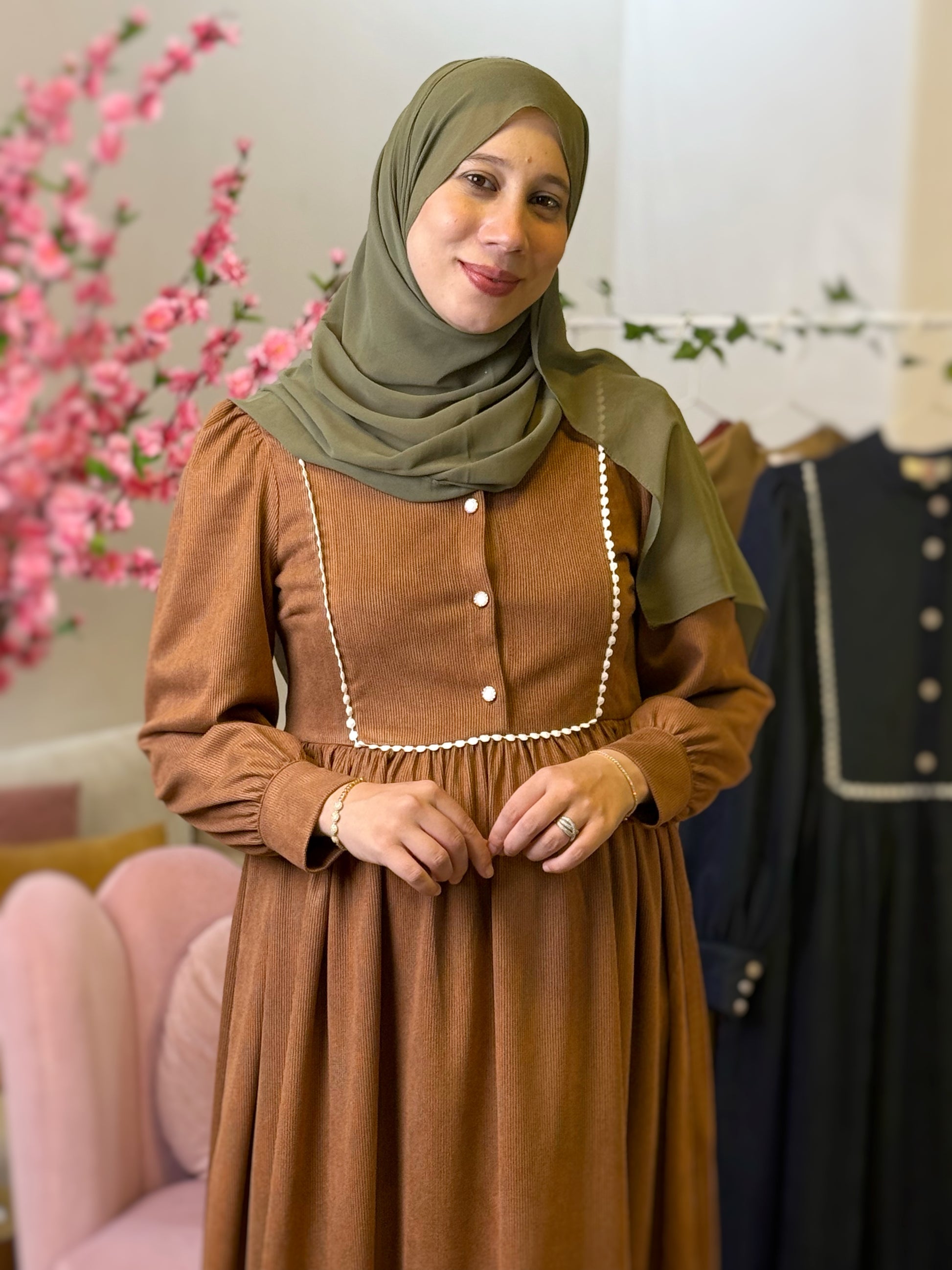 فستان طويل بلون بني من ثوب قطيفة فودان مستورد بجودة أولى